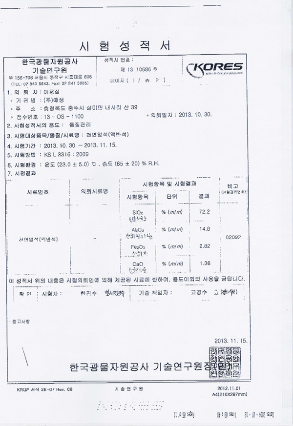 성분표 및 시험성적서